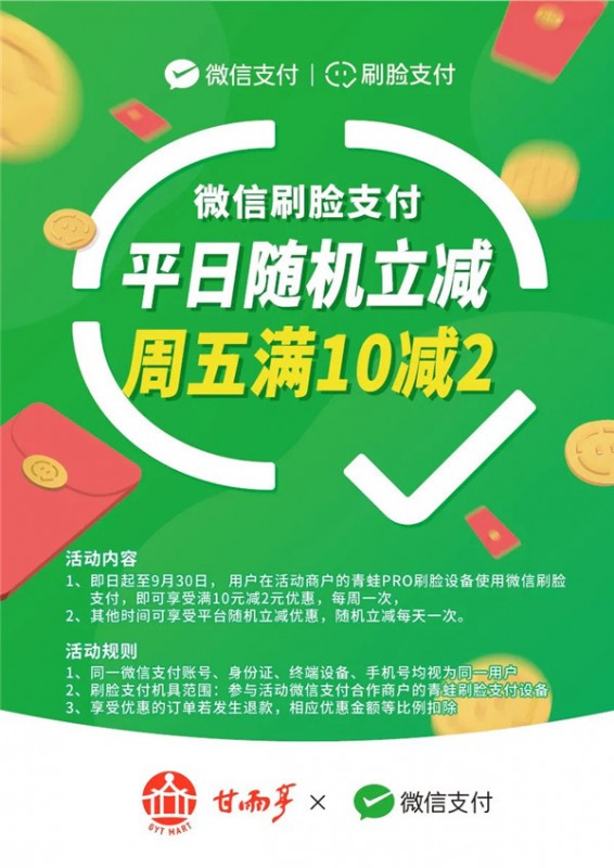 今天小雨給大家?guī)?lái)一個(gè)好消息:那就是:即日起至9月30日在甘雨亭使用微信刷臉支付可享受隨機(jī)立減優(yōu)惠 周五滿10減2 周五滿10減2 (注:每人每周可享一次優(yōu)惠,名額有限先到先得。) 平日隨機(jī)立減 ...